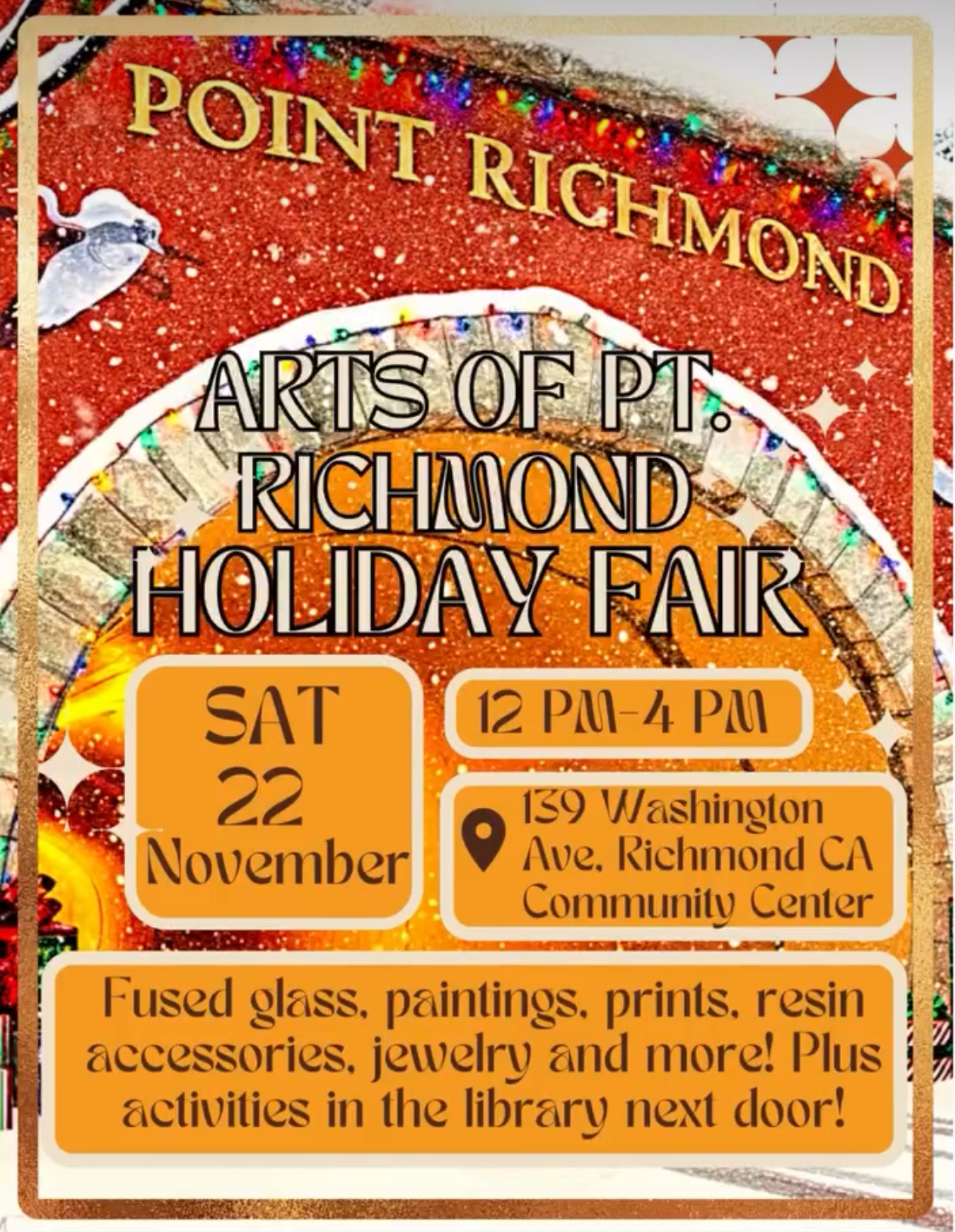 Shop local art and get ready for the holidays at Arts of Point Richmond’s “Holiday Fair,” Saturday, Nov. 22 from 12-4 p.m. at the Point Richmond Community Center.
