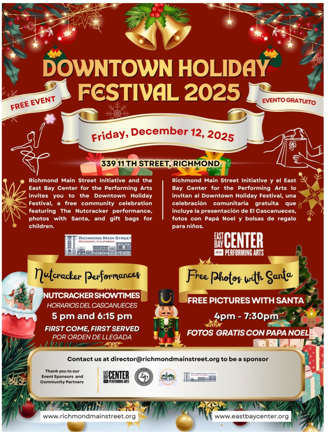 The heart of Richmond will sparkle this season as the “Downtown Holiday Festival,” presented by Richmond Main Street Initiative (RMSI) and East Bay Center for the Performing Arts, transforms the historic Winters Building into a hub of holiday cheer on Friday, Dec. 12 from 4-7:30 p.m.