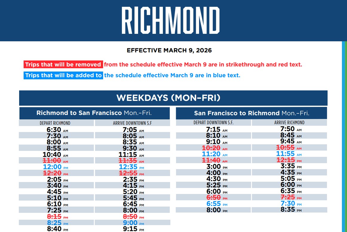 These updates affect both morning and evening commuters traveling between the Richmond Ferry Terminal and the Downtown San Francisco Ferry Building.