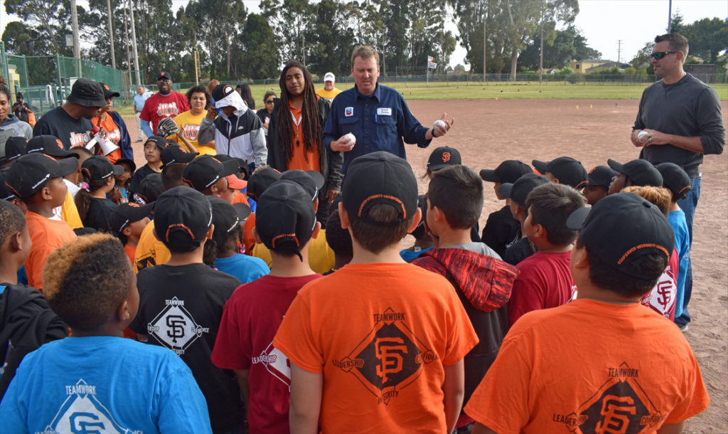 More than play ball, Affeldt joined the Jr. Giants in conducting science experiments as part of an education partnership with Chevron.