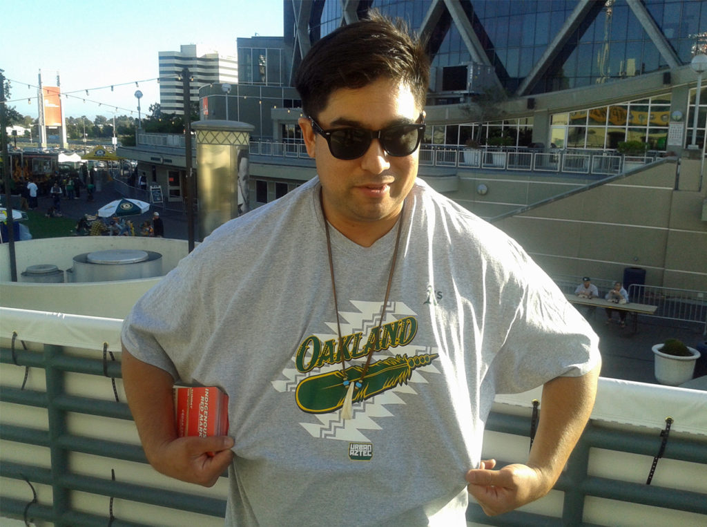 He wasn’t alone — the T shirts were a big draw. The shirts are designed by Jesse Hernandez, of Oakland, who goes by Urban Aztec, and who is known for blending graffiti with the art of Indigenous cultures in his artwork.