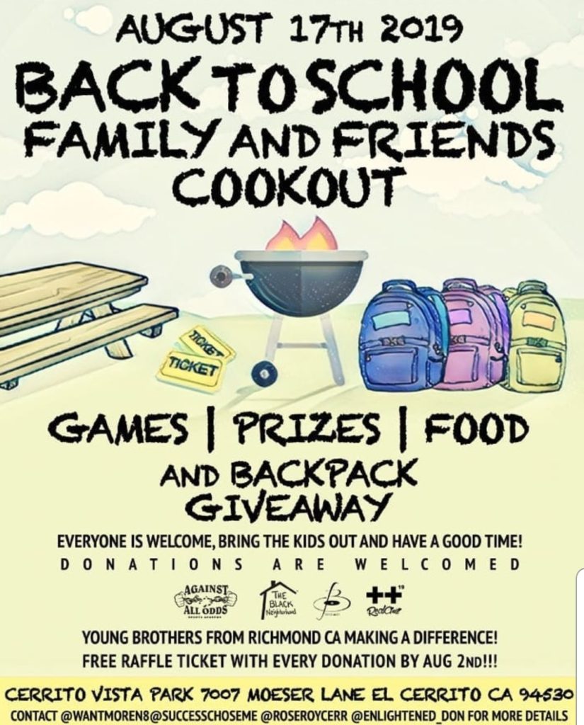 A group of local residents and community-based groups will host a back to school cookout, on Saturday August 17 at Cerrito Vista Park, 7007 Moeser, Lane, El Cerrito.
