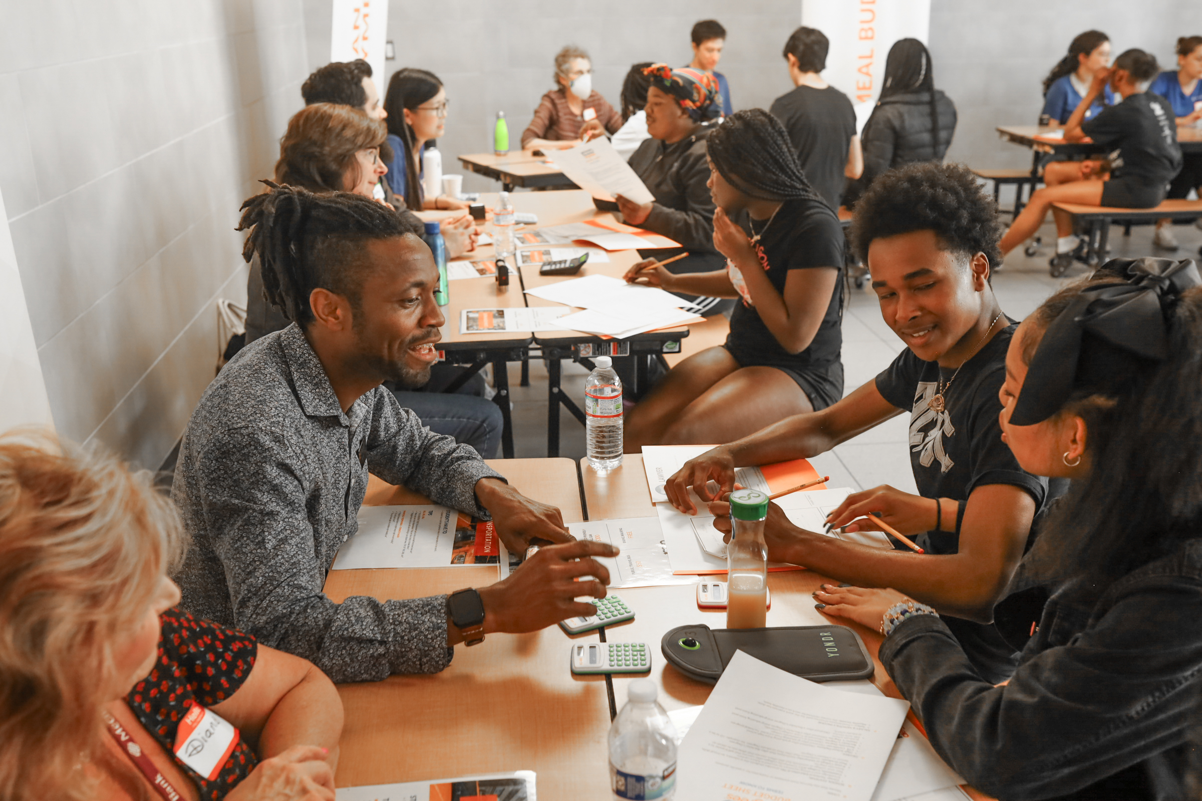 Students rotate between seven stations facilitated by 10,000 Degrees staff and volunteers. At each station, students are challenged to make difficult budgeting decisions, including being encouraged to spend more than they should on products and services they may or may not need to demonstrate the results of poor financial decision-making.