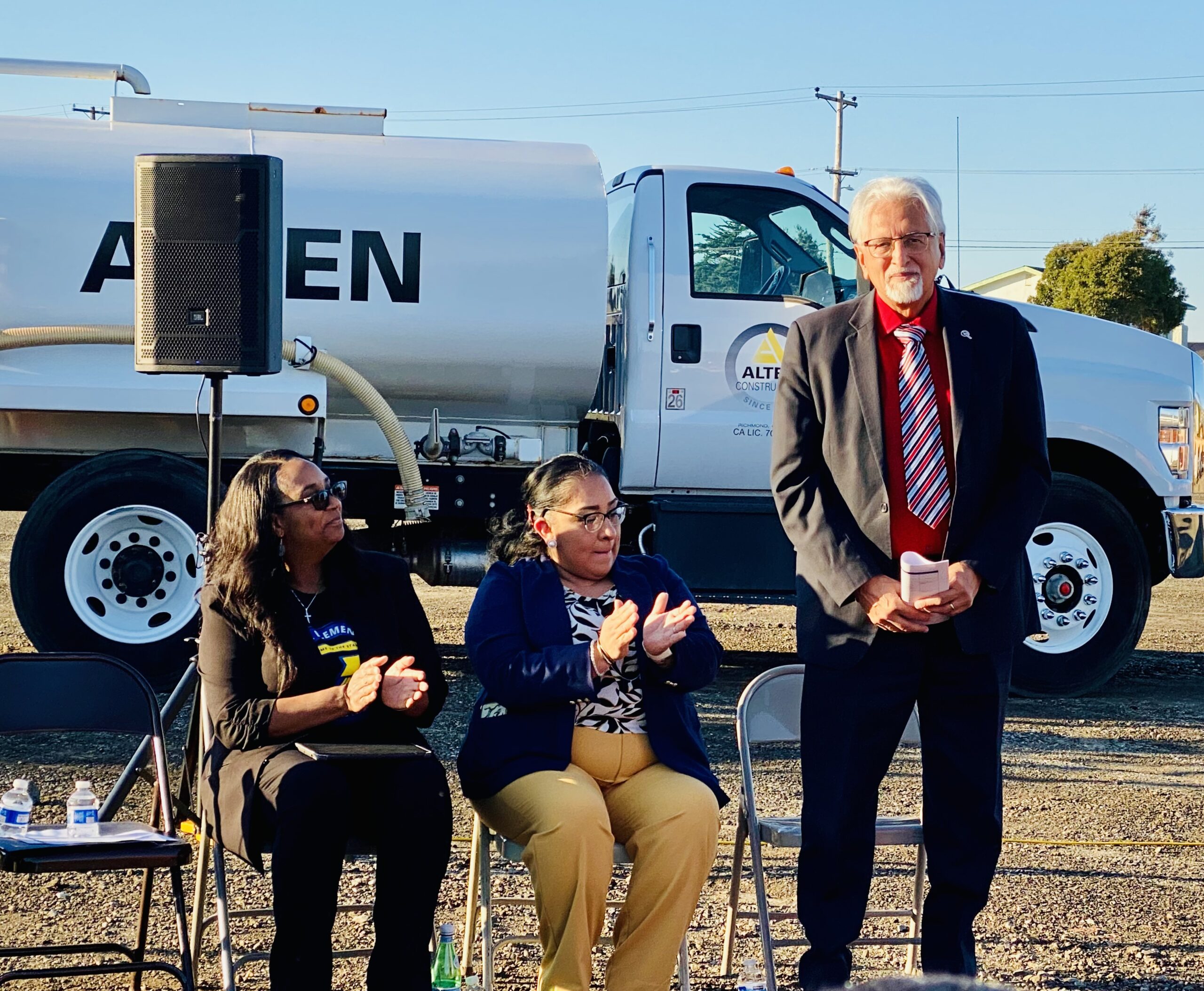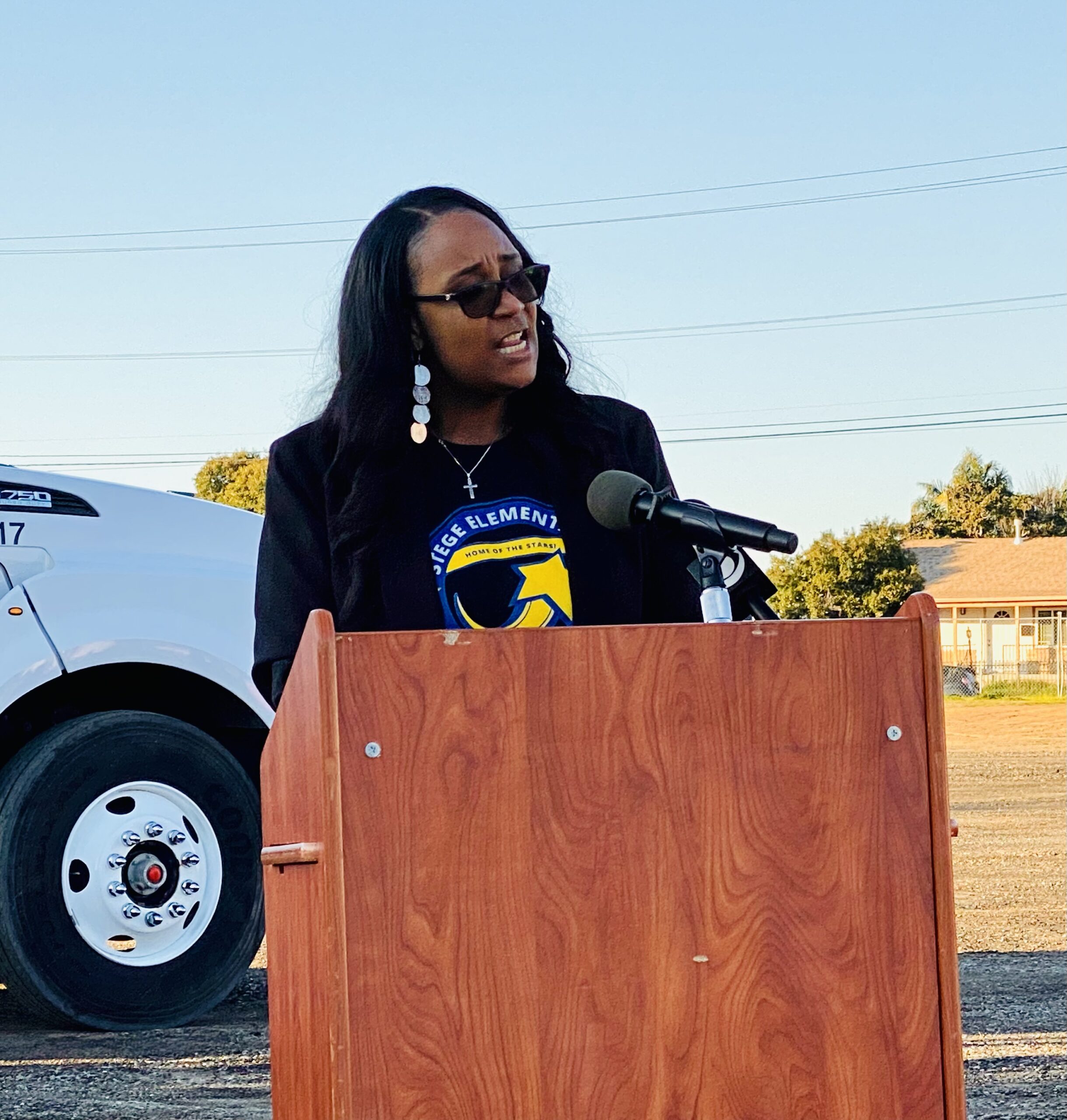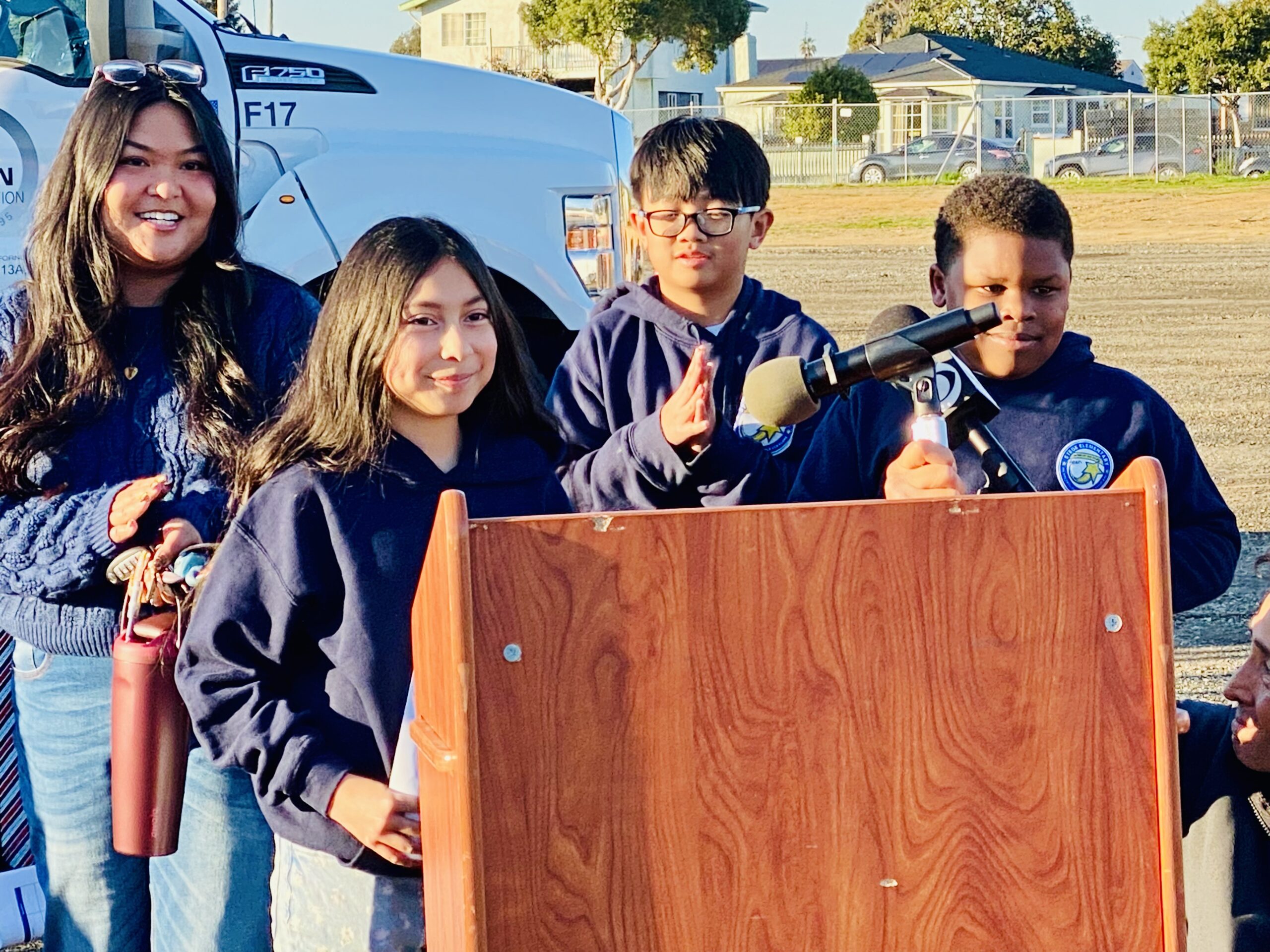 Before an American flag and an Alten Construction truck, the outdoor celebration featured remarks from members of the “Stege Village” group that helped launch the project, including WCCUSD Superintendent Cheryl Cotton, the School Board’s Guadalupe Enllana and Demetrio Gonzalez-Hoy, Stege Principal Claudia Velez and the district’s Ellen Mejia Hooper, as well as County Supervisor John Gioia, Mayor Eduardo Martinez and other partners. Current and former students, neighbors, community members, construction personnel and architects were also highlighted.